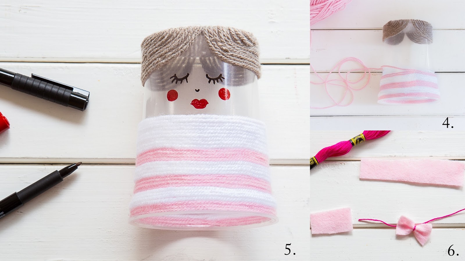 Nun wird der Becher mit der Wolle umwickelt. Wir fangen mit der Frisur an.