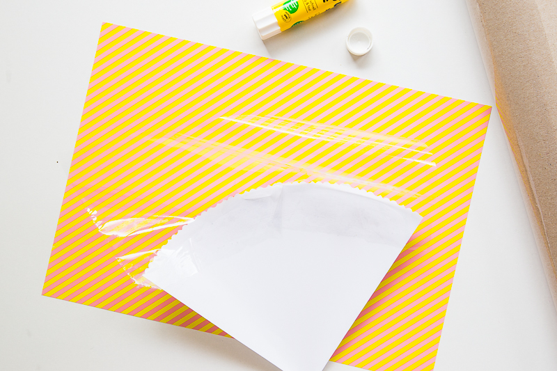 Schneidet jetzt ein Stück Klarsichtfolie zurecht und klebt diese am runden Rand fest.