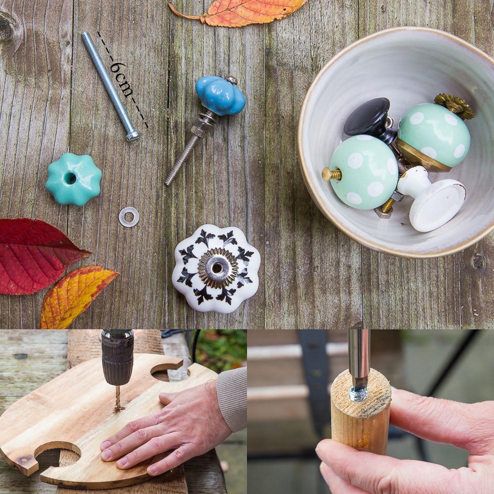 und in der Mitte des Brettes ein vorbereitendes Loch für den Knauf bohren.